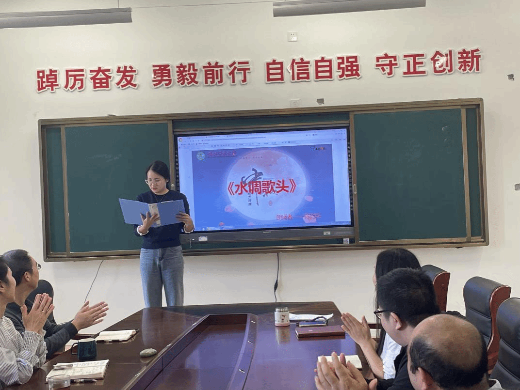 活动现场,诗词氛围浓厚。按照“抽签排序、个人诵读”的竞赛形式,10位教职工按序依次登台,围绕中秋、明月、家国等主题,诵读经典诗词作品。从“但愿人长久,千里共婵娟”的美好期许,到“海上生明月,天涯共此时”的辽阔意境,再到“明月几时有,把酒问青天”的哲思感悟,教职工们以标准的普通话、饱满的情感,将诗词的韵律之美与文化内涵展现得淋漓尽致。部分教职工还巧妙搭配了轻柔的背景音乐与简约的视觉背景,进一步烘托诗词意境,让现场观众沉浸式感受中华传统文化的魅力。